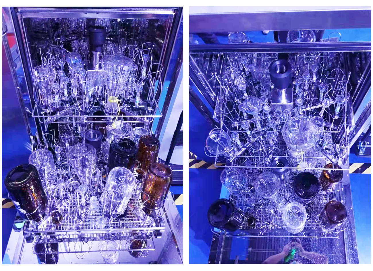 主要待清洗器皿以25ml以下容量瓶,250ml左右三角瓶、试剂瓶为主,器皿都呈现瓶口小,瓶肚大的特点,手工清洗难以完全覆盖器皿内部。方案配置:实验室主机1台,上层48位清洗篮架,一套,下层48位清洗篮架,1套。