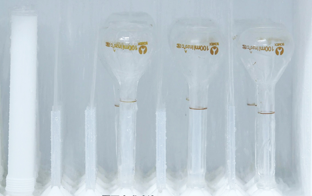 第一步:注射式亚沸酸蒸清洗,超纯酸蒸汽通过导管清洗器皿内壁,器皿内慢慢被酸气充盈,酸气慢慢冷凝流下,带走金属离子残留。