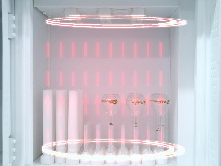 第三步:热风干燥,管道压缩风机把经过HEPA过滤后的热空气吹入器皿内部,高效烘干。
