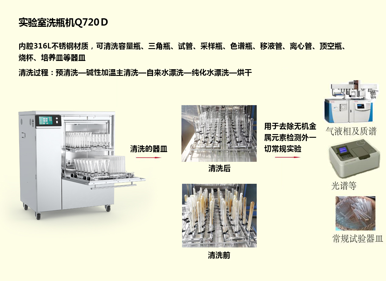 目前市面上的洗瓶机分为两大类,一类是用于常规清洗的实验室洗瓶机,应用重点在于清洗常规污染物,例如清洗瓶子里的油污、农药、色素、蛋白质、灰尘等;