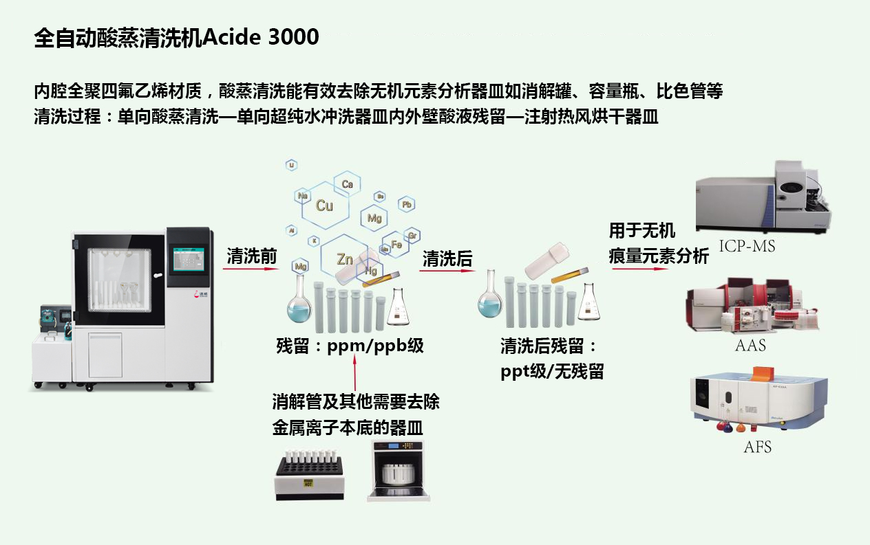 看到这里您是否有个疑问:难道常规实验室洗瓶机不能洗干净金属离子本底么?答案是如果器皿内金属离子含量非常高,用常规实验室洗瓶机是不能完全清洗掉。另外洗瓶机本身材质为不锈钢,本身会有金属离子溶出,清洗完成后金属离子本底不能满足ICP-MS、原子吸收、原子荧光等ppt\ppb\ppm级别痕量检测需求,不能代替酸蒸清洗机去除痕量金属离子本底;同理,酸蒸清洗机也不能代替实验室洗瓶机洗干净普通污染物,瓶子里的油污、农药、色素等必须用碱性清洗剂配合大流量及高温的水喷淋清洗才能清洗干净,大多数酸蒸清洗机是用硝酸蒸汽熏蒸器皿,只能去除无机金属离子本底,对普通污染物几乎没有作用,即便是目前具有120L/h水喷淋流量的语瓶酸蒸清洗机Acide3000,喷淋水作用2-3秒高效冲洗能把酸熏蒸凝集的酸及离子本底迅速冲洗干净,也不能够达到清洗常规污染物的水平。